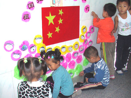 中一班的集体活动“祖国是阳光,我是花”通过认识国旗――幼儿与教师共同制作花朵――孩子们把自己的画像贴在花朵上等一系列活动,不仅锻炼了幼儿动手操作的能力,更激发了幼儿热爱祖国的情感。(摄影:张伟花)