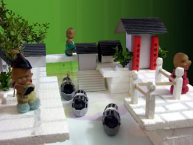 制作材料:作品主要材料是废旧的泡沫制成的地、小船、栏杆、柱子、小桥;大小营养品盒子制成的房子;废旧的KT板制成底板、阶梯;大小营养品盒子制成的房子;水果盒内的夹板制成的瓦片屋顶;棒冰棒制作的栏杆;挂历纸制成的乌篷船的篷、乌毡帽;旧毛线勾成的衣、裤,利用文字和树木、花草加以点缀,组成了一幅具有典型的立体江南水乡的画面。