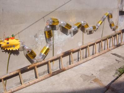选用材料:大的可乐瓶、橙汁瓶、旧电线、竹竿、粘贴纸