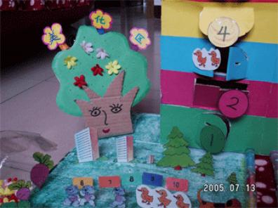 8、制作一些数量不一样的动物卡片,1――20的数字卡片、大小不一样的水果卡片,高矮不一样的楼房卡片等,将卡片下方粘上一小段牙签,用于“美化区”。