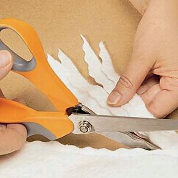 注意:剪出形状时尽量将边缘剪成波浪形,如果担心剪得不好可以先用铅笔画出轮廓后再剪;袜口向外卷收边,收边宽度约10厘米。
