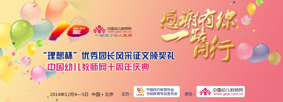 作为幼教领域最具规模和影响力的网络平台,中国幼儿教师网已走过了十个年头。为庆祝中国幼儿教师网成立十周年,中国幼儿教师网与中国民办教育协会学前教育专业委员会在全国范围内联合发起了“理想杯”优秀园长风采-说说我的职业故事征文活动,本次活动得到了全国各地幼教同仁的积极参与,全国百余名园长分享自己在职业之路的经验和感悟,交流优秀教育思想,展示园所精神面貌。评审委员会对参选稿件进行了严格评选,并于2014年12月4-5日在北京隆重举办了颁奖典礼。本次教师网十周年庆典活动还为参会园长设置了卓越园长培训活动,为来自各地园长提供了一次学习交流、观摩的机会,搭建了多角度、多领域、多层次的沟通平台。此次活动,参加会议园长826人,覆盖全国26个省份,堪称幼教界行业盛会,开创了中国幼教新格局,促进了幼教行业的全面发展。